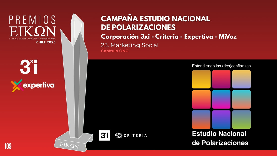 Fuimos reconocidos en los Premios Eikon Chile 2025 por la Campaña Estudio Nacional de Polarizaciones, desarrollada junto a Corporación 3xi, Criteria y MiVoz.